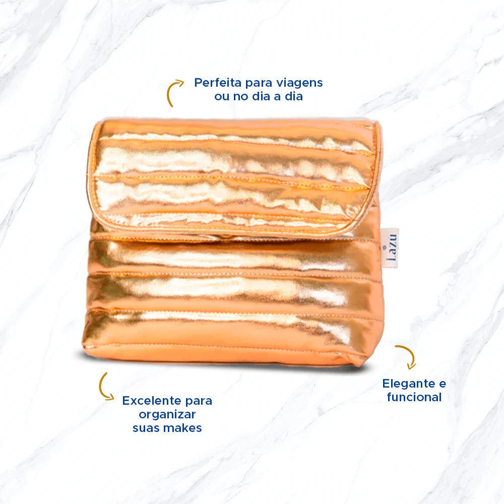 A Necessaire Glamour Dourada da Lazú é o equilíbrio perfeito entre elegância e funcionalidade. Projetada para quem valoriza a organização, ela é ideal para guardar seus produtos de beleza e acessórios, seja em viagens ou no dia a dia. Compacta e estilosa, essa necessaire não só protege seus itens, mas também eleva seu visual, tornando cada momento mais sofisticado e especial.